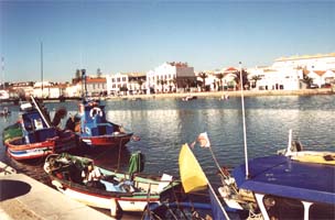 Blick vom Hafen über den Rio Gilao zur Ostseite Tavira´s, Vormittags kann man hier den Fang der vom Meer einlaufenen Fischerboote begutachten und die anschließende, spannende, Fisch-Versteigerung besuchen